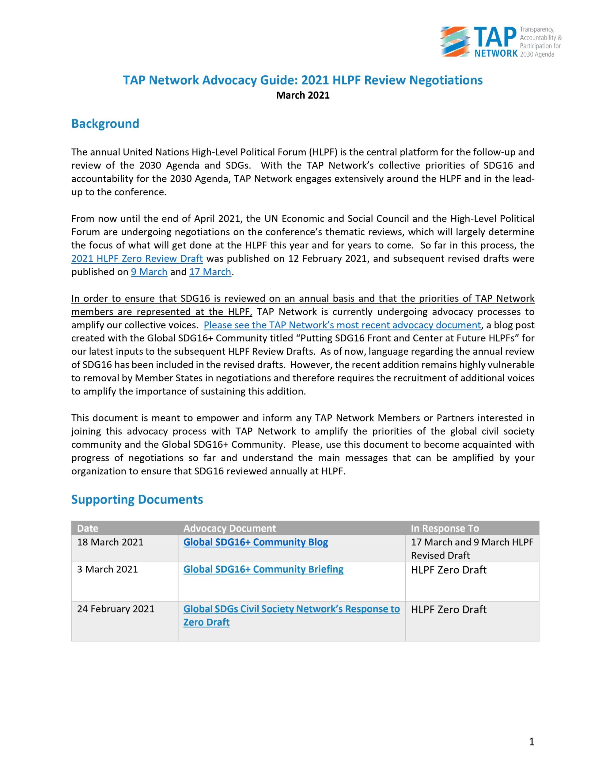Throughout February to April 2021, the UN Economic and Social Council and the High-Level Political Forum will undergo negotiations on the conference’s thematic reviews, which will largely determine the focus of what will get done at the HLPF this year and for years to come. In order to ensure that SDG16 is reviewed on an annual basis and that the priorities of TAP Network members are represented at the HLPF, TAP Network is engages heavily in the surrounding advocacy processes to amplify our collective voices. Created to empower TAP Network Members and Partners, please reference this Advocacy Guide on how to engage in these process.