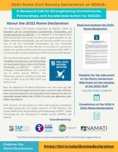 The 2021 Rome Civil Society Declaration on SDG16+, titled “A Renewed Call for Strengthening Commitments, Partnerships, and Accelerated Action for SDG16+,” is an addendum to the original 2019 Rome Declaration and serves as a firm and urgent reminder for the global community that peaceful, just and inclusive societies are at the core of not only sustainable development, but also sustainable recovery, especially at a time like this. In the midst of a protracted global crisis, the Rome Declaration 2.0, presented at the 2021 HLPF, is a renewed call for accelerated action on SDG 16 and the 2030 Agenda.