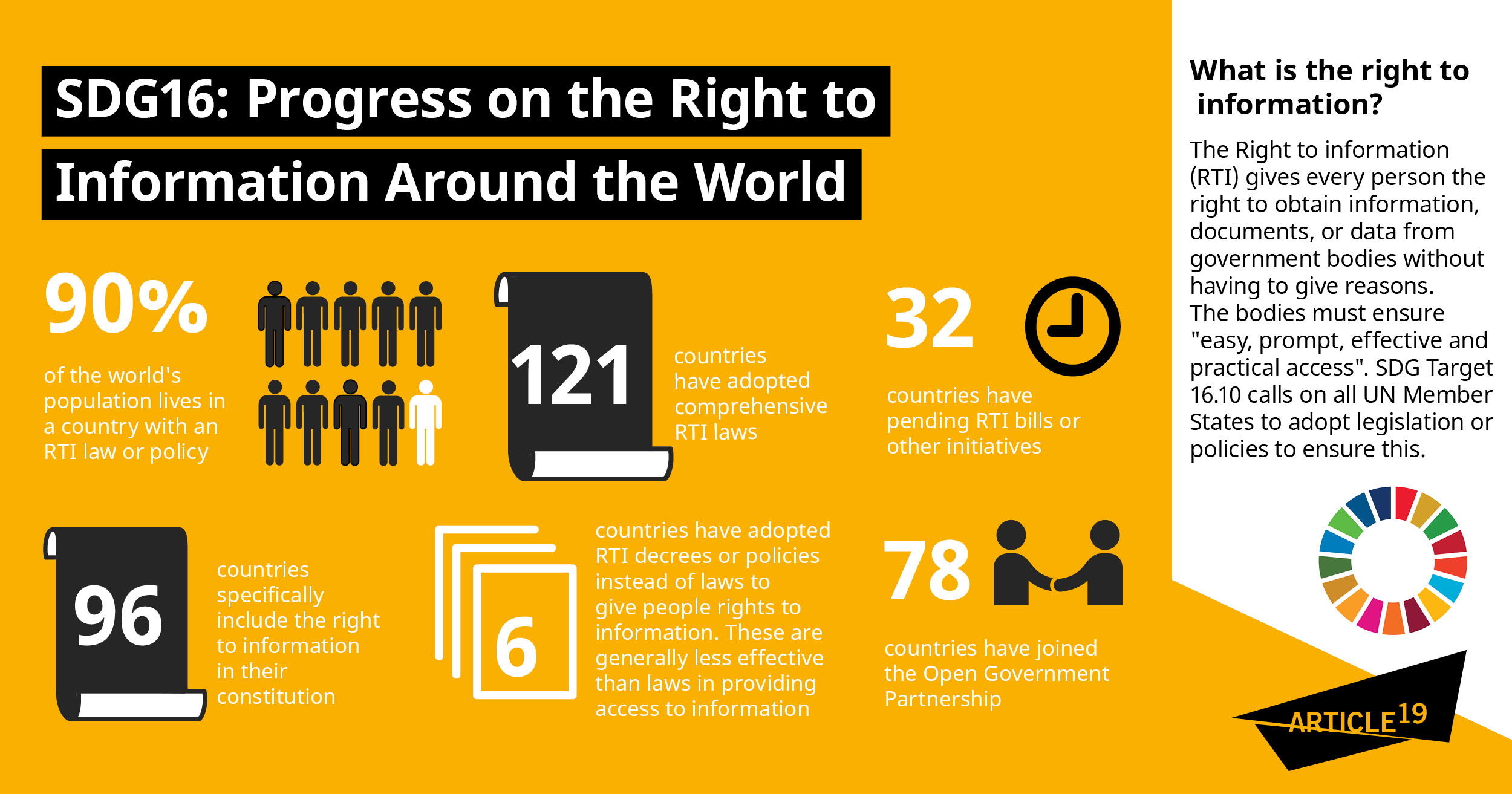 Article 19 has continued to promote implementation of SDGs at the global and national levels. Globally, this includes supporting as the secretariat of the the Friends of Governance for Sustainable Development Group in New York, organising workshops and publishing books (http://friendsofgovernance.org), advocacy at the UN in Vienna on synchronising the SDGs with the implementation of the UN Convention on Corruption, and working with UNESCO on monitoring of implementation of SDG 16.10. Nationally, ARTICLE 19 regional offices in Kenya, Tunisia, and Brazil has worked with other local groups to develop action plans with governments and shadow reports, as well as run projects relating to specific SDG goals on access to information, public participation, environment, health and water. It has also been part of the successful campaign to bring the Escazu Agreement into force in Latin America.